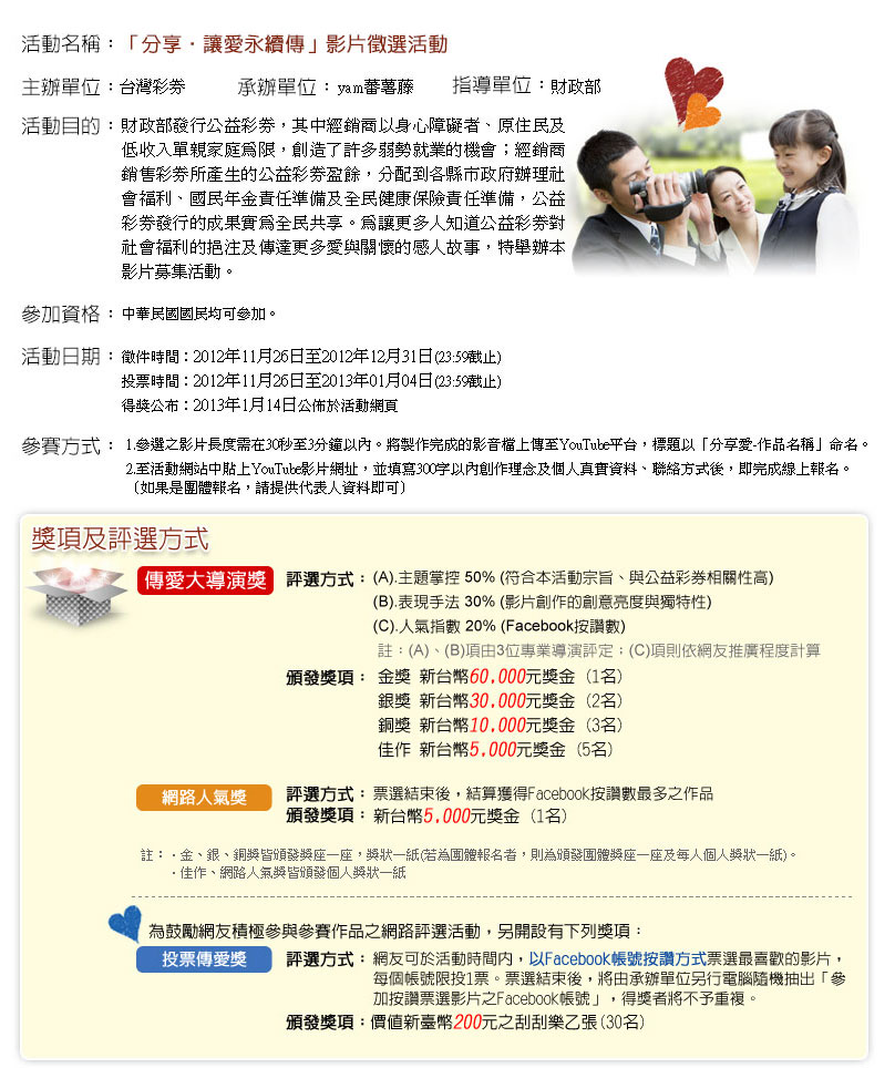 就參加活動者(包含參賽者及參與網路評選參賽作品活動者)所填具之個人資料,參賽者應同意主辦單位得基於為執行本活動相關事務之目的而為蒐集、處理及利用。 |